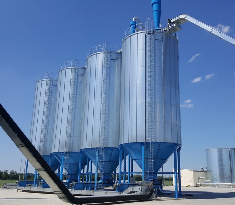 Silo se šikmou střechou je navrženo pro jeden vstup materiálu a je ideální pro menší a střední provozy. Díky konstrukci šikmé střechy se maximalizuje využitelný objem a zajišťuje bezpečné skladování v souladu s požadavky norem ATEX a NFPA. Naopak silo s plochou střechou umožňuje napojení více dopravníků současně, což z něj činí vhodné řešení pro větší systémy manipulace s materiálem. Nabízí stejnou úroveň bezpečnosti, flexibility i odolnosti jako provedení se šikmou střechou. Oba typy sil lze konfigurovat podle potřeb zákazníka – v různých rozměrech a s volitelnými výstupními podavači (mohou být vybaveny násypkou nebo skrytým patrem pro odsávání šnekem) v závislosti na dopravovaném materiálu a požadavcích na údržbu.