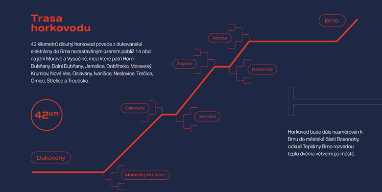Do dvou let by měla začít realizace jedné z největších investic do energetické infrastruktury v historii samostatné České republiky. Plánovaný horkovod z Jaderné elektrárny Dukovany do Brna má přivést teplo více než 100 tisícům domácností, ale také školám, nemocnicím a dalším veřejným budovám. Dokončený by měl na přelomu let 2031 a 2032. Brno by tak učinilo významný krok k snížení závislosti na zemním plynu a energetické soběstačnosti.