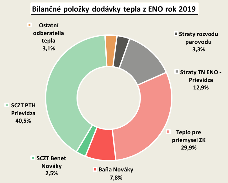 Zdrojom tepla pre oblasť Hornej Nitry bol zdroj KVET v ENO, pričom hlavnou činnosťou ENO bola výroba elektriny z domáceho uhlia pre ES SR. Výroba elektriny bola ekonomicky podporovaná ako VHZ SR. Celková ročná spotreba uhlia postupne klesala z 2,5 mil. ton, t.j. 7,0 TWh na 1,2 mil. ton, čo je menej ako 3,5 TWh PEZ. Výroba elektriny vo VHZ klesla v roku 2019 na úroveň 870 GWh/rok a celková dodávka tepla bola na úrovni cca 280 GWh, t.j. 1000 TJ/rok. V tom čase už bol stanovený termín ukončenia výroby elektriny vo VHZ z domáceho uhlia na 31.12.2023. V roku 2019 bola potreba tepla z SCZT v meste Prievidza 115 GWh (415 TJ/rok). Na obr. 1 sú položky dodávky tepla pre obyvateľstvo, priemysel a občiansku vybavenosť vo všetkých troch lokalitách. Priama dodávka tepla pre priemysel bola v pare, dodávka pre obyvateľstvo sa uskutočňovala v horúcej vode cez TN 2×DN200 z ENO do Zemianskych Kostolian. Hlavná vetva dodávky diaľkového tepla bola cez TN z ENO do 15 km vzdialenej Prievidze. TN zásoboval cca 1200 bytov v meste Nováky a 14 500 bytov v Prievidzi. Dimenzia TN bola 2×DN600 a dĺžka trasy 14,5 km. Prenosová schopnosť TN pri teplotnom spáde 150/70 °C bola 137,0 MW tepelných.