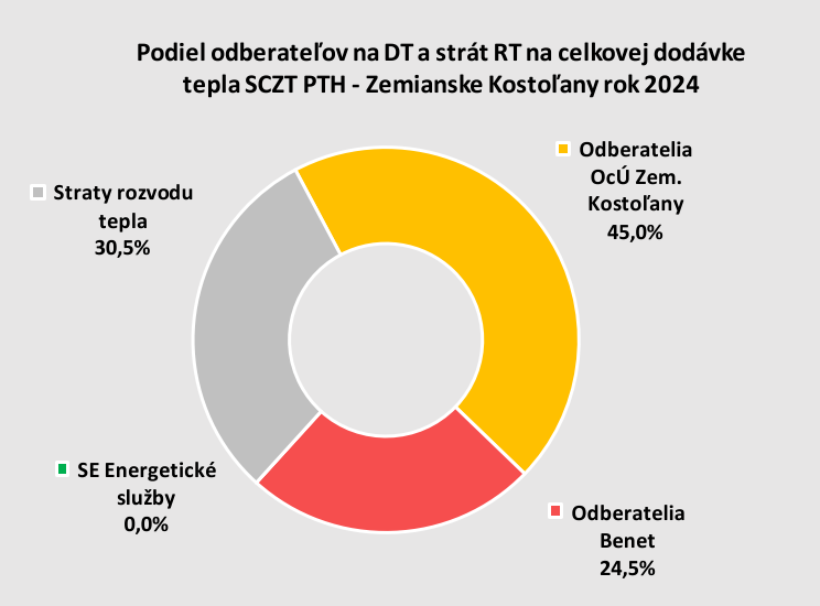 V obci Zemianske Kostoľany ako v jednej z mála obcí v SR sa dlhodobo rozvíja SCZT, bolo to najmä zásluhou Slovenských elektrární, ktoré v katastrálnom území obce prevádzkovali viac ako 80 rokov prvú systémovú elektráreň ENO. Odberateľmi tepla sú bytové spoločenstvá, OcÚ Zemianske Kostoľany, RD, v ktorých bývali aj mnohí zo zamestnancov ENO a organizácie, ktoré obchodovali s ENO, a subjekty občianskej vybavenosti vo vlastníctve SE. OcÚ mal eminentný záujem na zachovaní SCZT, aby sa to uskutočnilo, bolo potrebné vybudovať nielen CZ tepla, ale aj zrekonštruovať rozvody tepla, problémom je nízka dodávka tepla. Pôvodné položky dodávky tepla sú ako podiely odberateľov v roku 2019 na ľavom grafe obr. 8 a v roku 2024 na pravom grafe obr. 8. Z obrázkov je zrejmé, že „dočasne“ vypadol odber v objektoch SE, celková dodávka tepla sa znížila na polovicu a straty stúpli na trojnásobne. Je predpoklad, že DT do opustených objektov (ubytovne, sklady, ...) sa obnoví.