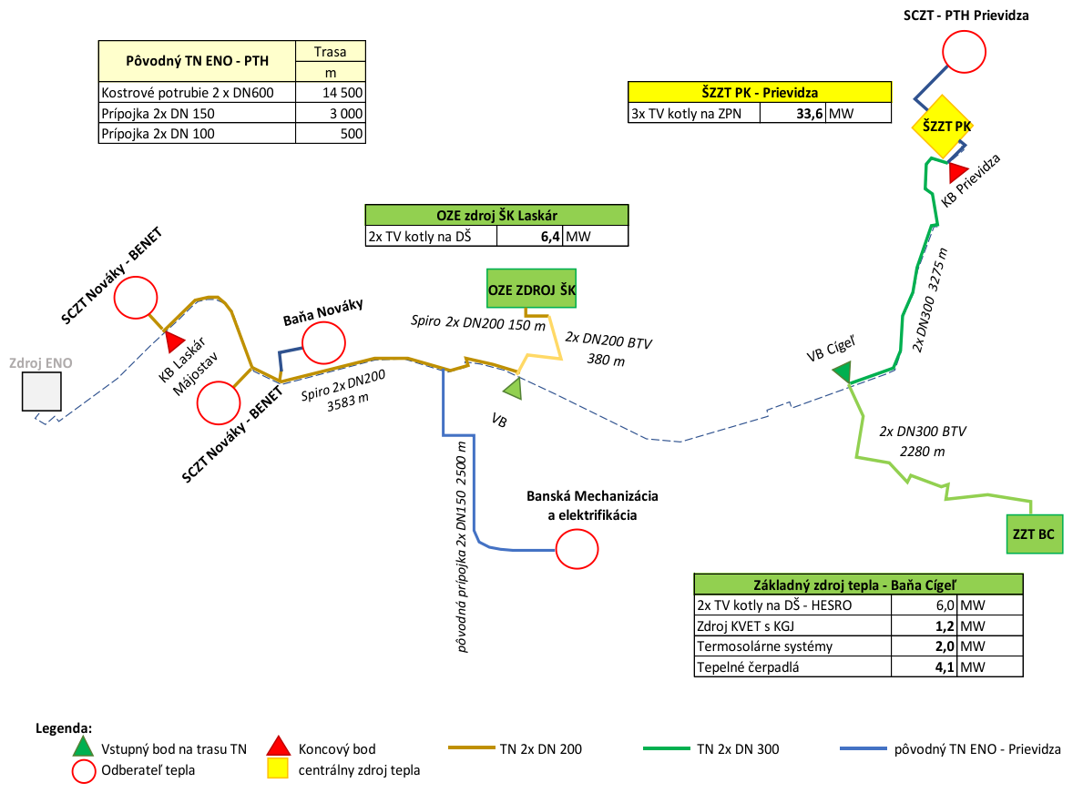 Distribúciu tepla v Prievidzi vykonávala spoločnosť Prievidzské tepelné hospodárstvo, a.s. Prievidza (PTH), ktorého koncepcia zásobovania teplom bola vybraná ako náhrada po roku 2023 pre celú oblasť. Na obr. 2 je schéma prepojenia CZ tepla v Prievidzi s CZ KVET v bani Cígeľ a CZ tepla v Laskáre pre odberateľov tepla v SCZT Nováky.
