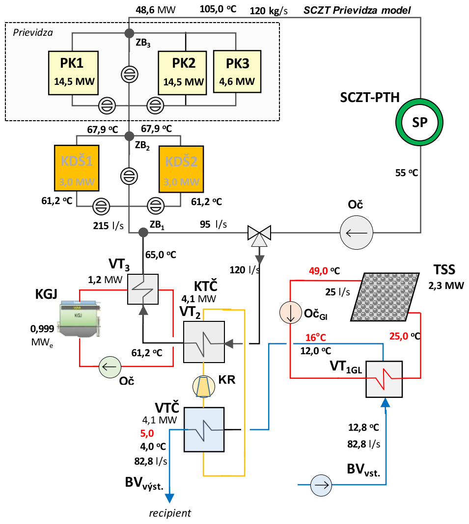 Kotolňa na biomasu, drevné štiepky (DŠ) s celkovým tepelným výkonom 6,0 MWt je jestvujúci zdroj tepla, ktorá je osadená dvoma kotlami s výkonom 2 × 3,0 MWt. Zdroj je vybavený tak, aby spoľahlivo plnil požiadavky na dodávku tepla a zabezpečil 50% podiel tepla z OZE. Zariadenia na výrobu tepla sú zapojené podľa principiálnej schémy obr. 3. Zdroj KVET s KGJ na ZPN s výkonom do 1,0 MW vyrába elektrinu na pohon tepelných čerpadiel. TČ zapojené do dvoch kaskád s dvoma TČ s inštalovaným tepelným výkonom 4,1 MWt transformujú teplo získané z banských vôd do výstupnej vody SCZT, ktorú na požadovanú teplotu dohreje teplo z KGJ s inštalovaným tepelným výkonom 1,2 MW. V období mimo vykurovacieho obdobia sa takto získané teplo dodáva do SCZT Prievidza. Termo-solárne systémy s výkonom do 2,3 MW umiestnené na ploche bývalej skládky uhlia predhrievajú banskú vodu alebo ohrievajú vratku, aby SOP TČ bolo maximálne možné.